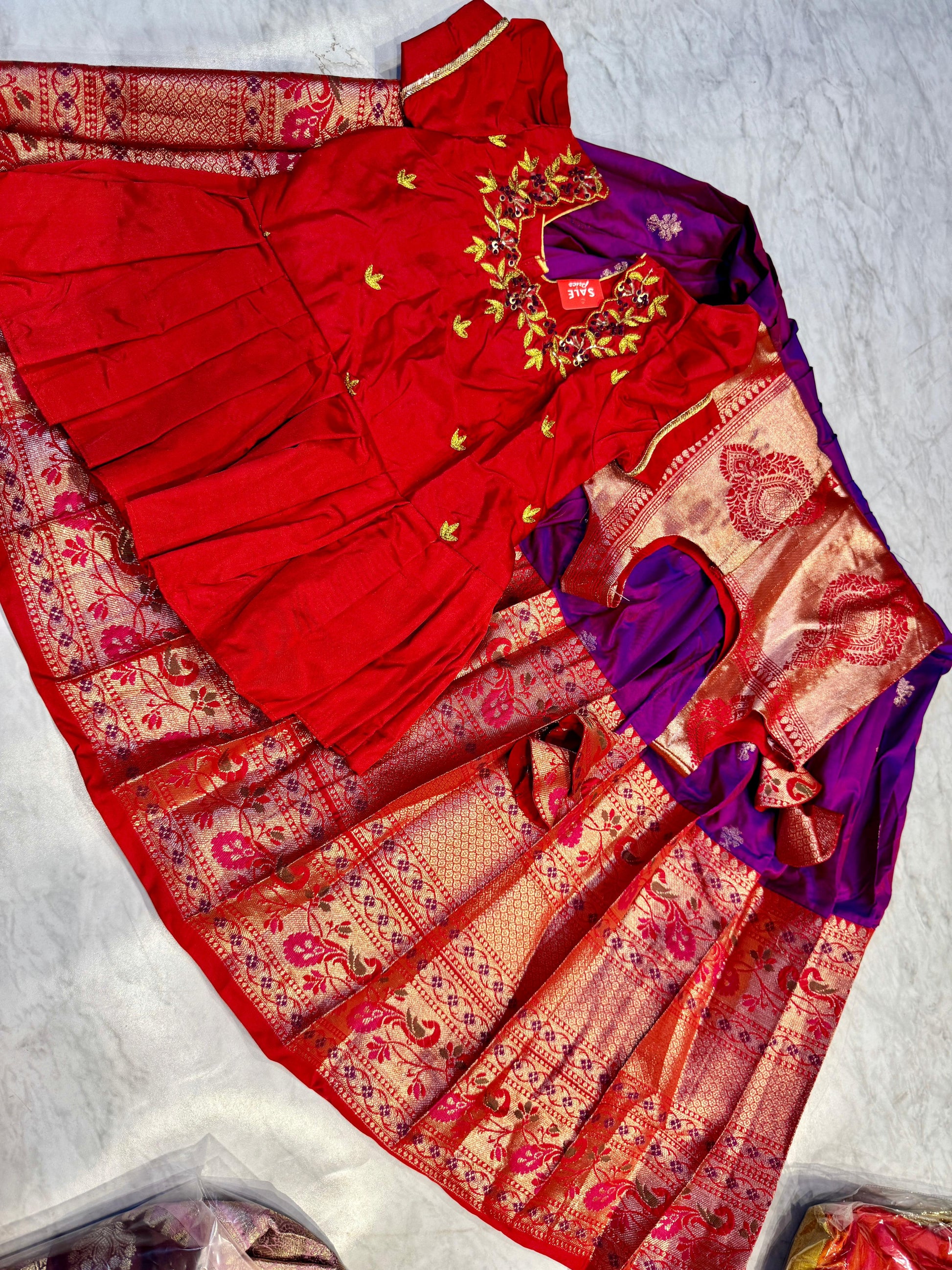 Ready-to-wear saree for ages 3 to 5 years, featuring inner lining and available in premium fabrics like Kanchi Pattu, Gadwal, Banarasi, and Soft Silk, with extra margins provided for adjustments.